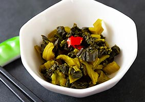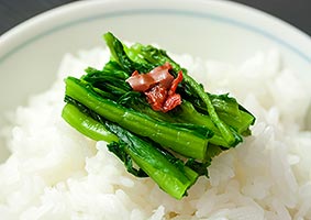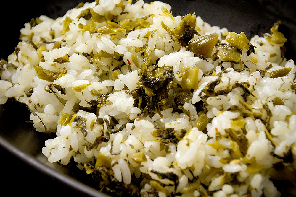 また、高菜漬けには、3~4%の塩分で浅漬けした緑鮮やかな「新漬け」と、多めの塩分でじっくり漬け込んだベッコウ色の「古漬け」があります。新漬けは春の味覚であり、そのまま刻んで新鮮な香りと辛味を楽しむことが出来ます。古漬けは漬け物として凝縮されたうまみがありますし、油でいためたり、高菜めしにするなど、料理としてもおいしく食べられます。どちらも、一年を通じて阿蘇の食卓になくてはならない一品です。